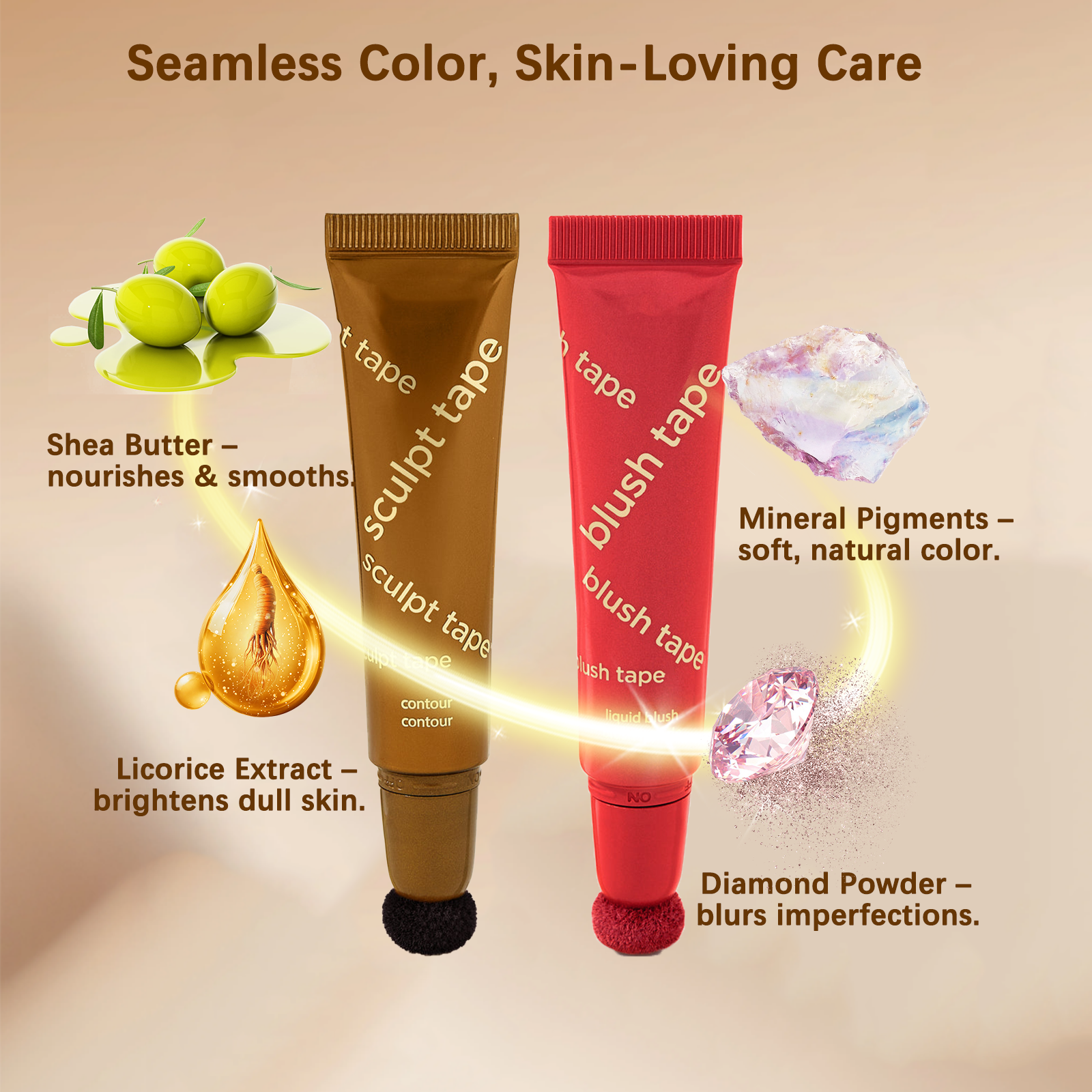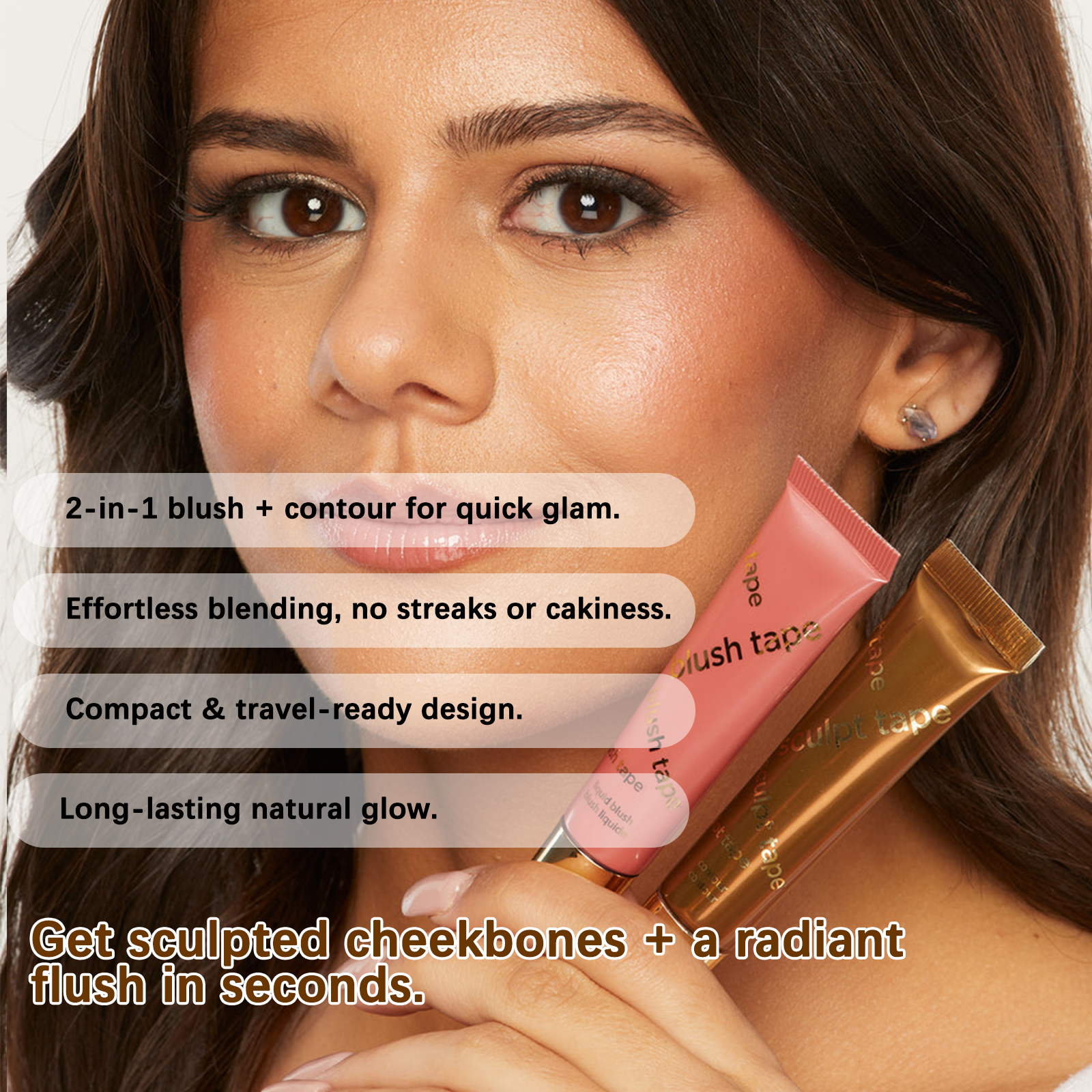 With Sculpt Tape & Blush Duo, achieve professional results in seconds — smooth, buildable liquid pigments that melt seamlessly into your skin for a flawless, natural finish.