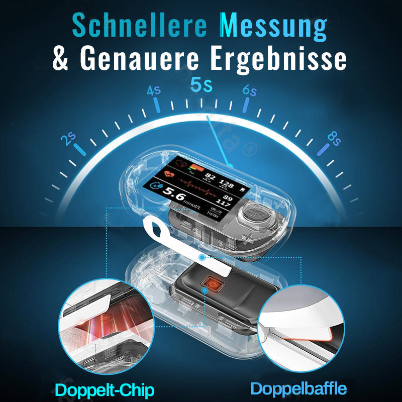 Clinclii™ is equipped with a powerful internal chip featuring intelligent algorithm technology. It quickly and accurately records each pulse. With an ultra-low energy consumption MCU control chip and the advanced "LAMBERT BEER" algorithm. it captures measurement signals fast and delivers quicker. more accurate results. By using photon chip technology and the "optical absorption spectrum" measurement method. it provides precise blood sugar readings.