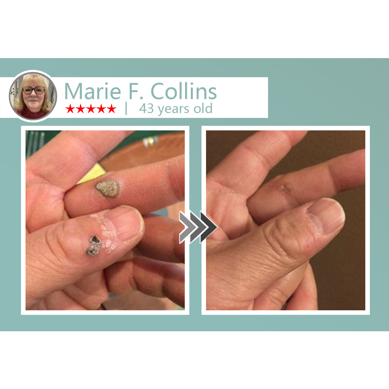 "I’m 45 and constantly meeting clients. Those little blisters on my face make me feel very embarrassed. After using the patch for two days, they started shrinking and drying up. By day five, they fell off in the shower. Totally painless and far more effective than freezing or acid treatments I tried before."