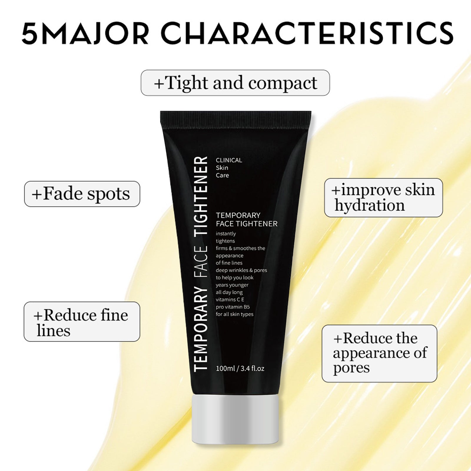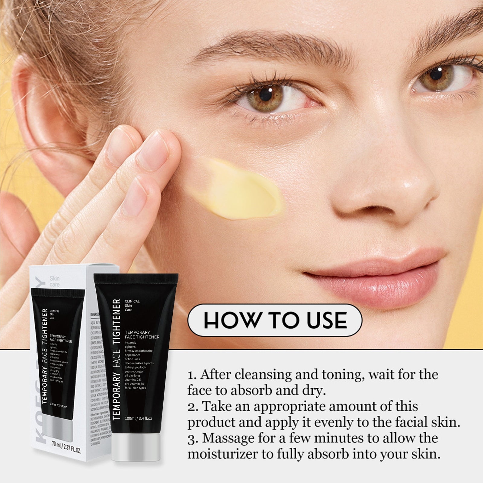 • The effects of Instant Temporary Face Tightener work best on clean, dry skin. If you require additional hydration and must use a serum or moisturizer, allow the products to fully absorb and dry before applying Instant Temporary Face Tightener.